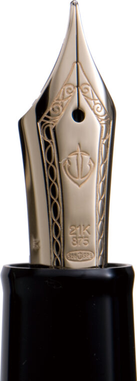 セーラー万年筆独自の技術で成し得た21金ペン先。万年筆のペン先として多く使われている14金や18金に比べて弾力をもたせており、筆圧が強くかかったときでもペン先の切れ込みが開くことなく、インク切れが起こりにくくなります。“しなる” ように紙面を滑り、常に安定したインク供給で“フェザータッチ” とも言われる快適な書き味が楽しめます。しなやかな書き心地を実現した、万年筆の原点が感じられる逸品です。