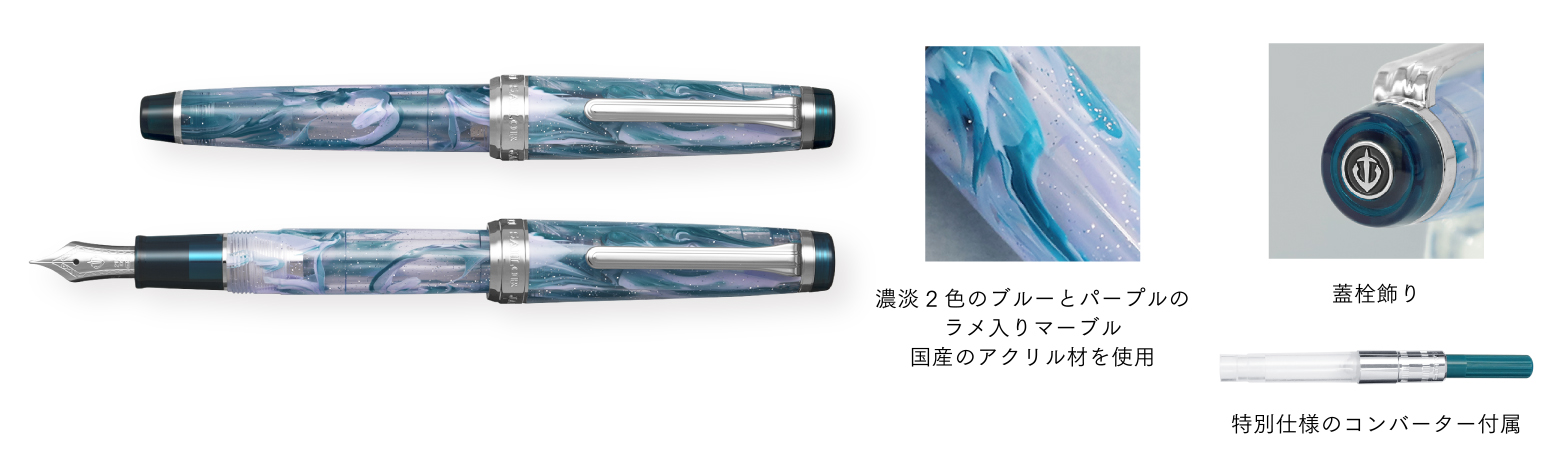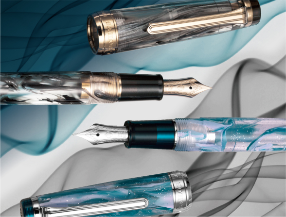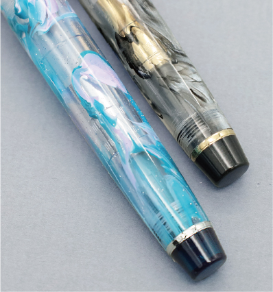 透明ベースの国産アクリル切削材を使用し、マーブル柄を万年筆の“顔”であるペン先を覆うベールに見立て、ベール(veil)と色(iro)を組み合わせた「VEILIO」シリーズ。