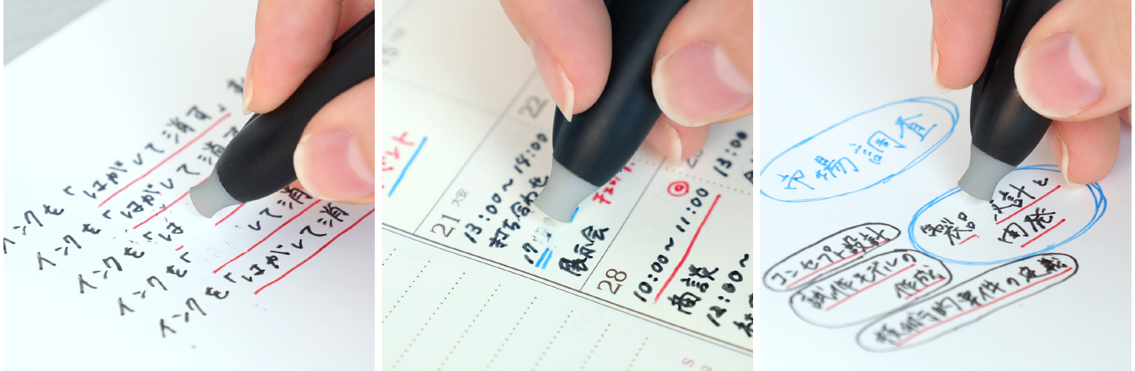 例えば手帳や日記、子どもの連絡帳など、間違えても専用の消し具できちんと消して書き直せるから、書くことがもっと自由に楽しくなる。