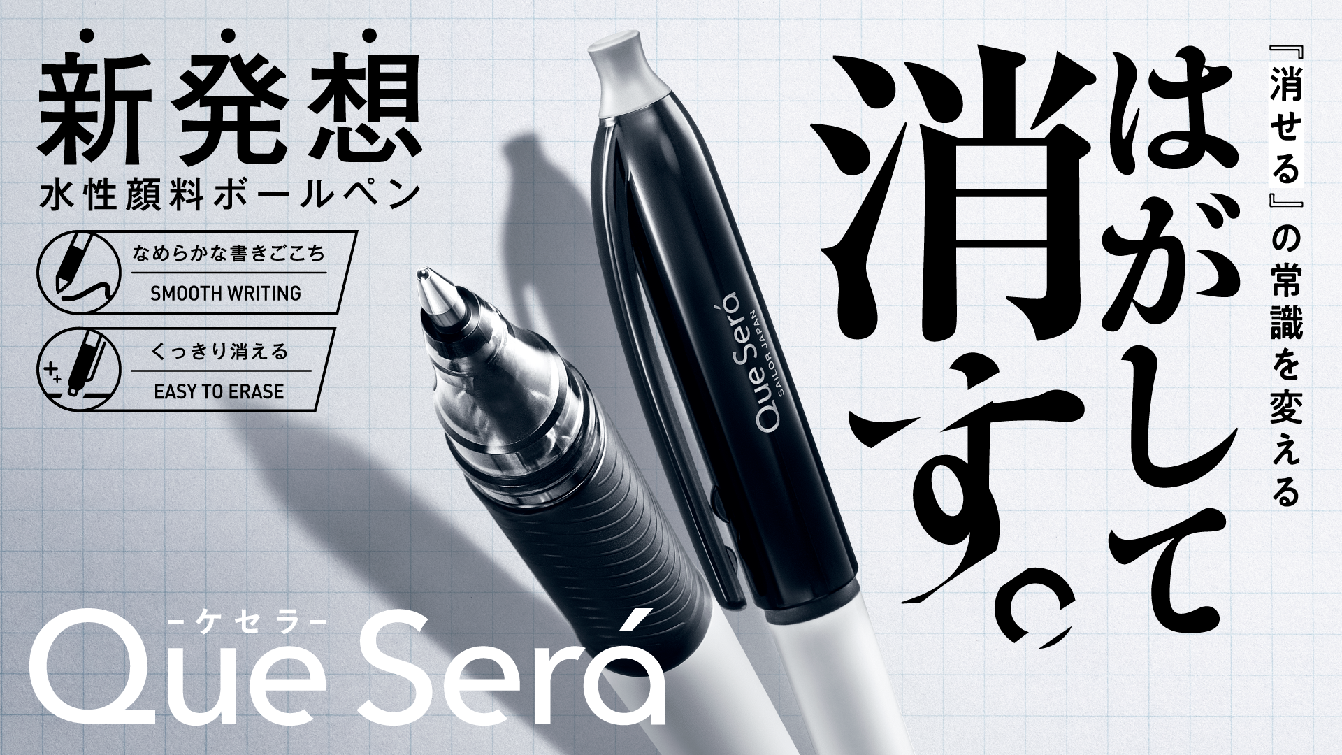 文具メーカー3社(プラス株式会社、ぺんてる株式会社、セーラー万年筆株式会社)共同開発のインク「Que Será」を搭載した、これまでにない“はがして消せる”ボールペン。
