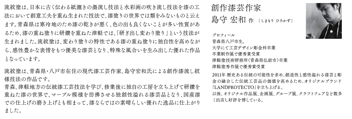 それぞれが伝統的な漆芸手法に独自の感性と技術を加えた創作漆芸品に仕上がっております。